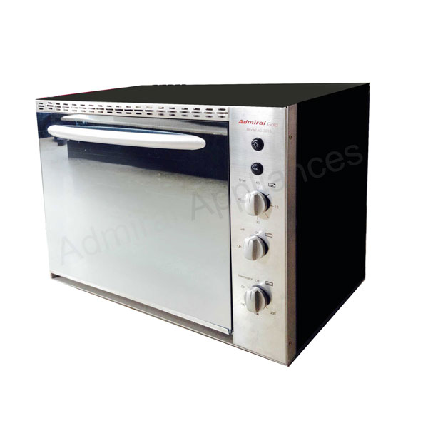 Oven lamp and rotisserie is included with stainless steel front panel and reflective mirror glass door